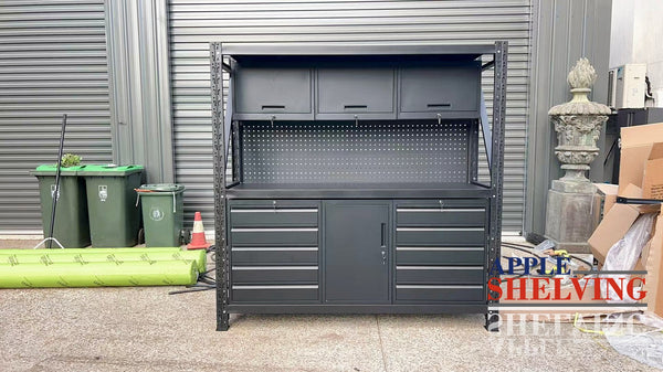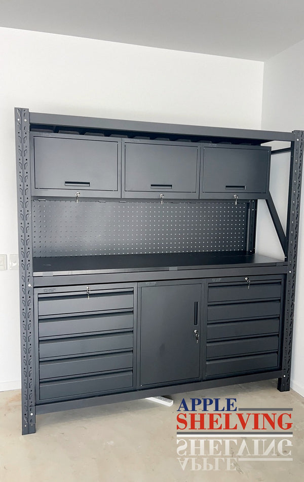 The system is built on a durable steel frame with crossbeam-mounted shelves and a rear pegboard for hanging tools. Optional upgrades include an MDF benchtop for a smooth working surface and castor wheels for mobility. Whether you’re a professional or enthusiast, this modular setup ensures function meets flexibility.